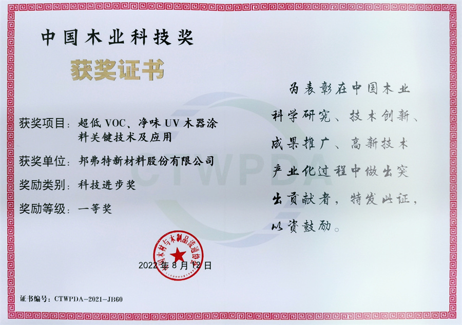低碳環保已成為全球關注的焦點,創新驅動是引領木業綠色升級的必經之路。邦弗特以“超低VOC、凈味UV木器涂料關鍵技術及應用”項目獲得“中國木業科技進步獎一等獎”,為木器涂料的科技創新獻上自己的一份力。